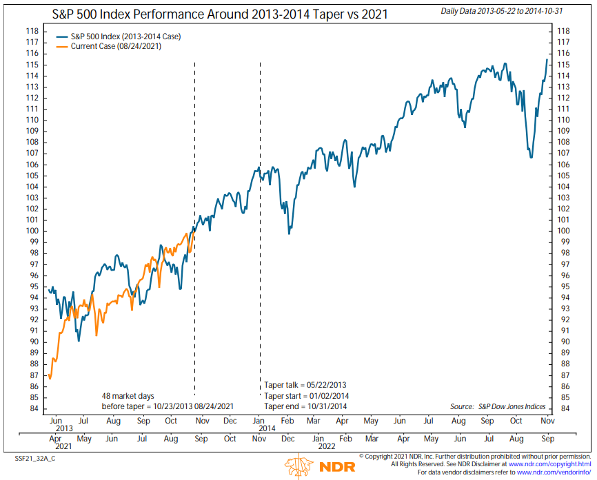 The macro team at NDR expects taper to start in November and end in June 2022. See chart below, but even discounting the fact that the S&P 500 uptrend is stronger now than 2013, it’s easy to see that Quantitative Easing is not a catastrophe for equities. A nice note to end the week on. Have a good second-to-last of the summer weekend.