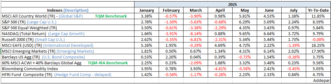 In July, the Trump administration’s announcement of several trade agreements, along with the passage of the One Big Beautiful Bill Act (OBBBA), added some clarity to the future policy backdrop and bolstered market risk sentiment. While the removal of uncertainty typically supports market values, it may have been investors’ willingness to overlook the potential long-term impact of the new tariffs that most buoyed prices during the month.