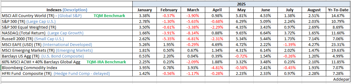 In a change of pattern, this month’s letter begins with the monthly index performance chart. As of September 14—two weeks into the month—the performance of the major indexes looks nearly identical to August, only compressed into half the time. Considering August and September are historically the weakest months of the year, the strength has been somewhat surprising.