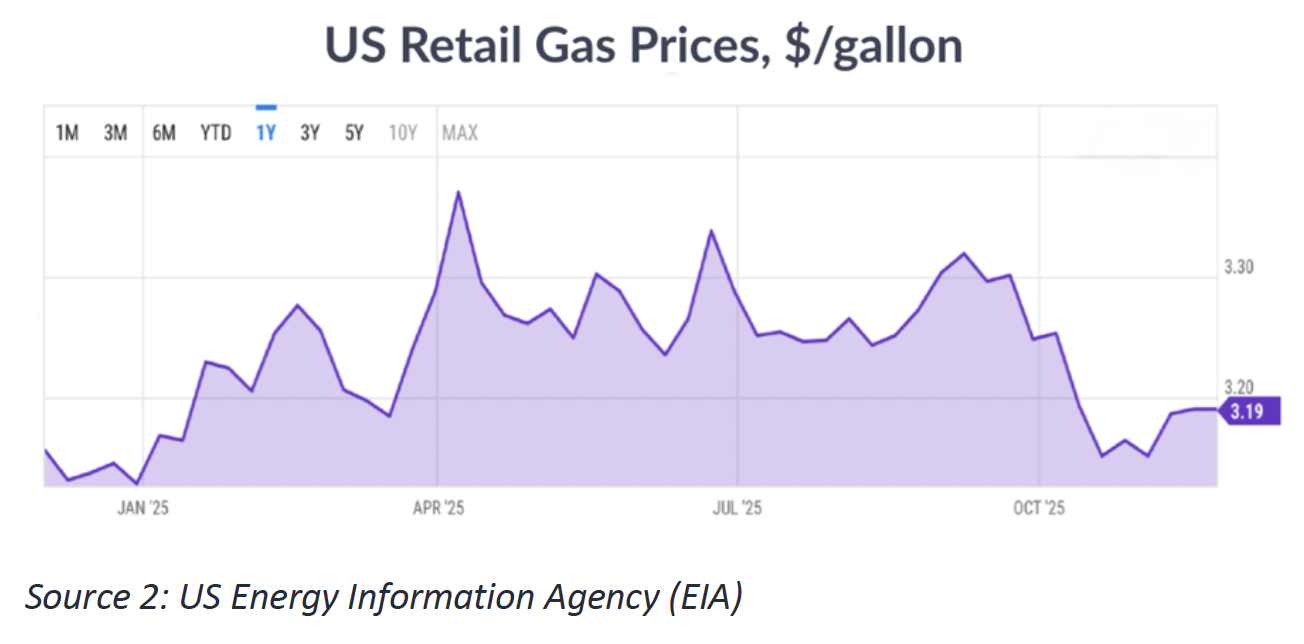 The decline in at-the-pump gasoline prices is helping put extra money in consumer pocketbooks and should impact (positively) the reported inflation numbers for the end of 2025. Although gasoline can possibly encourage more holiday travel, it is likely that the most significant effect, at the moment, is additional spending money, which will be spent