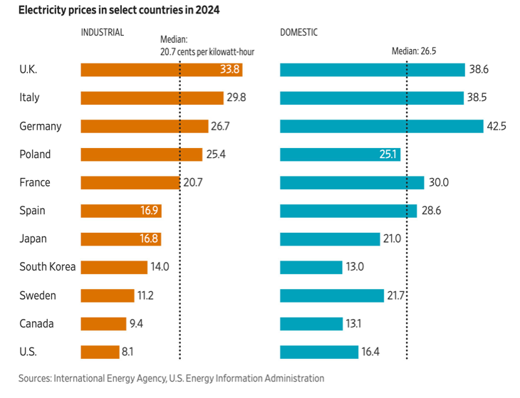 US electricity costs are by no means the highest in the world; quite the contrary. In Europe, various policy initiatives— as well as the war in Ukraine — have made energy costs uncomfortably high, prompting a re-examination of economic policy. European businesses are acutely conscious that access to “reasonably” priced energy is critical to being competitive in the global marketplace. The issue of electricity cost is going to become more and more important everywhere as AI-driven demand rises and well-intentioned policies collide with a broad-based need for economic growth.