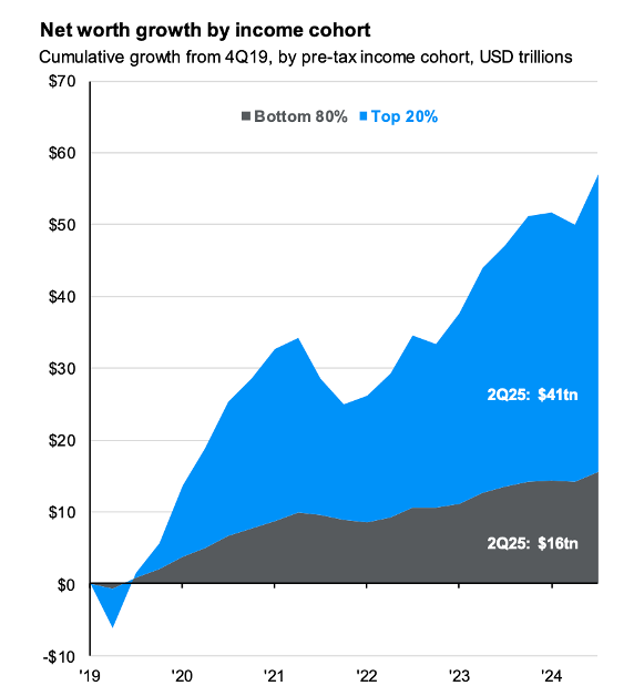 Part of the frustration is tied to political polarization and to media—especially social media—designed to provoke. But concerns about income inequality are also playing a central role. Research from JPMorgan indicates that between 2020 and mid-2025, the top 20% of earners saw their net worth rise by $41 trillion, while the remaining 80% saw gains of only $16 trillion (see Chart 1). These diverging outcomes are becoming more widely discussed, and the cost of living is likely to dominate the coming election.