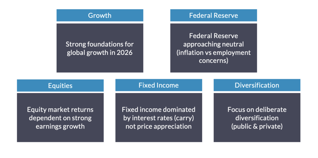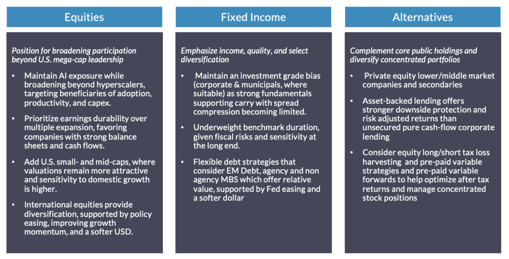 Resilient global growth, strong balance sheets, and policy support (monetary, fiscal, regulatory) support continued participation in risk assets. However, tight valuations, fiscal uncertainty, tariff volatility and AI-related concentration risks underscore the need for balance and diversification.