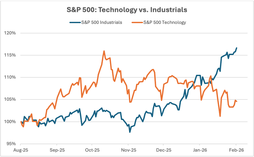 Chart 1: S&P 500: Technology vs. Industrials, 8/19/25-2/19/25.  Performance of the tech industry has been volatile as investors fret over the impact of AI on the sector. Source: Bloomberg, 2/19/26