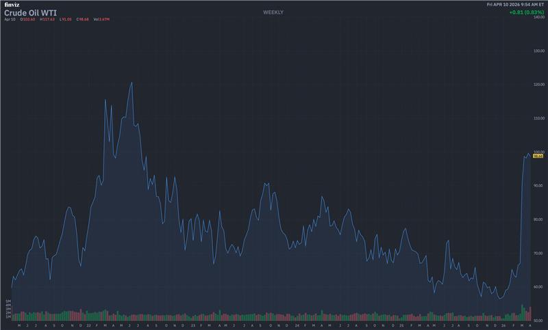 Chart 1: The Price of Crude OIL WTI, 1/1/2026-3/31/2026. Oil spiked in response to the Iran War and the closing of the Strait of Hormuz, and remains elevated even after the ceasefire has come into effect. Source: Finviz, 4/10/2026