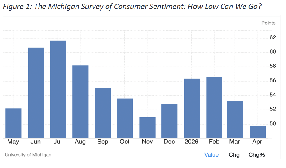 The final Michigan Consumer Sentiment number for April improved a bit over preliminary readings earlier in the month, reflecting the ceasefire in the war with Iran. Survey takers specifically cited the influence of the war and trends that were widely similar across demographic and political categories. The most eye-popping part of the report was the increase in one-year-ahead inflation expectations, which rose from 3.8% to 4.7%.