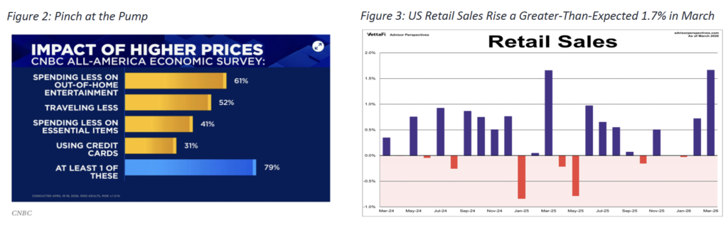 The Michigan Survey of Consumer Confidence is by no means the only survey out there. The CNBC All-America Economic Survey is a less prominent quarterly survey started in 2006, which, unlike the Michigan Survey, asks a variety of questions on topical issues. No subject is more topical at the moment than consumer spending and its ability to keep the US out of an economic recession. Spending less on various consumer products and services due to higher gas prices (see chart) does not necessarily mean spending less overall. Indeed, for the near term, higher gas prices will probably cause consumer spending to rise. US Retail Sales for March 2026 rose 1.7%, the biggest increase in over a year, driven higher by a 15.5% in retail gasoline sales.