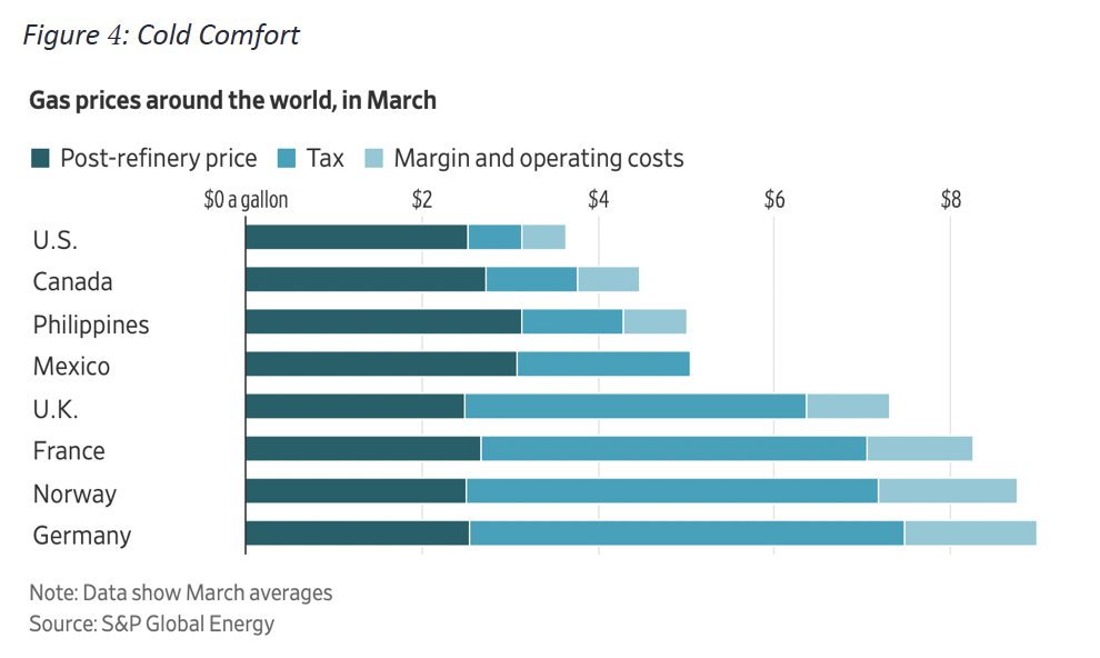 Retail gasoline prices in the United States are among the lowest in the developed world. Most other countries impose higher per gallon taxes in order to finance government budgets and a variety of expenditures; in Europe, gasoline taxes also have been explicitly used to encourage a shift away from carbon fuels. In contrast, the US uses gasoline taxes to pay for highways and other transportation-related projects, an approach that closely resembles a user tax. (California is an exception and of late has imposed gasoline taxes in a manner that more closely resembles Europe.) Perhaps the biggest surprise to many people, however, is the data suggesting that operating costs and profit margins are considerably lower in the US. Note that in Mexico, gasoline stations are privately owned but sell gasoline from the government-owned entity, Pemex.