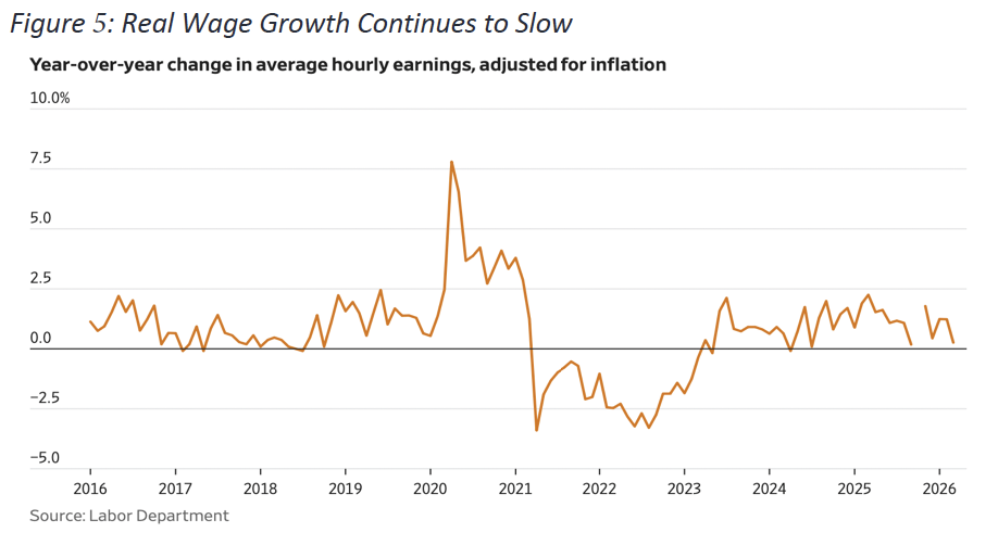 The ability of households to keep up in the face of broad inflationary pressures has been eroding for several months. This is more than just a story of rising gasoline prices. Although the unemployment rate has held steady and remains quite low, and immigration has fallen to virtually zero, an increase in average hourly earnings that might be expected in a tight labor market has not materialized. Detailed analyses of industries and job categories that were expected to be squeezed by higher labor costs as the availability of labor fell have consistently failed to detect any notable change in wage growth. Thus, as inflation has steadily moved towards 3% — measuring above 3% in March— the net effect is a reduction in the growth of spending power.